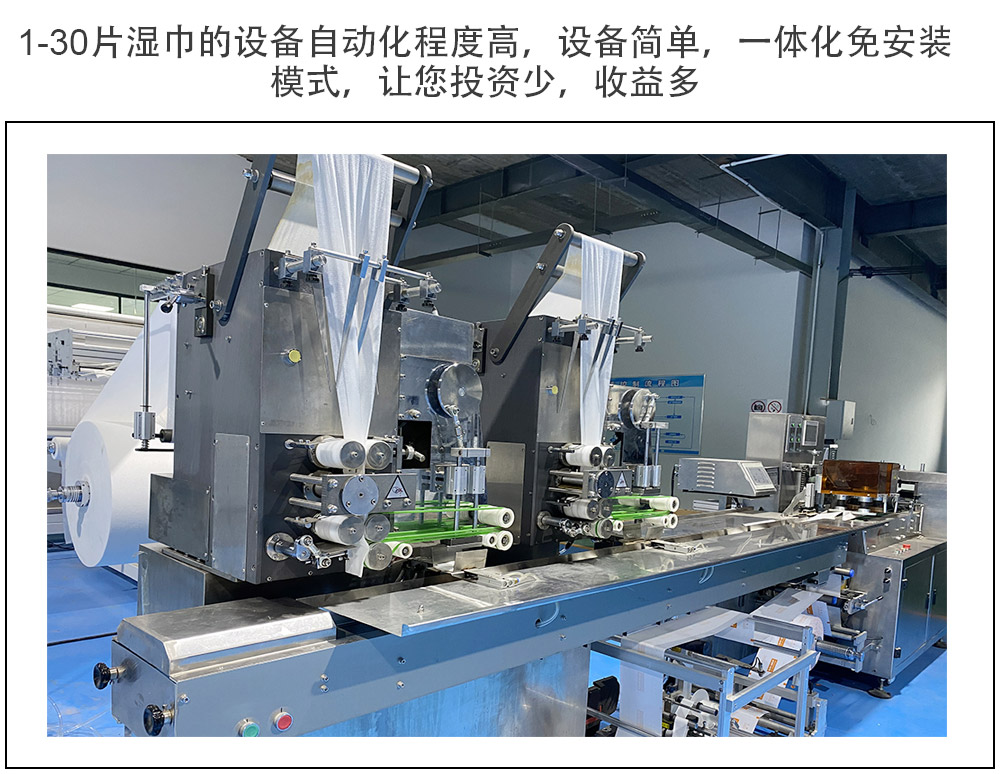 全自動濕巾包裝機適用于1-15片濕巾機,操作簡單穩(wěn)定,與液體接觸的部分全部為不銹鋼制成,整機由PLC控制,機器很漂亮。